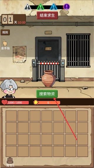 4、再次点击搜索物资收集新物资,积累背包物品,推进求生流程。
