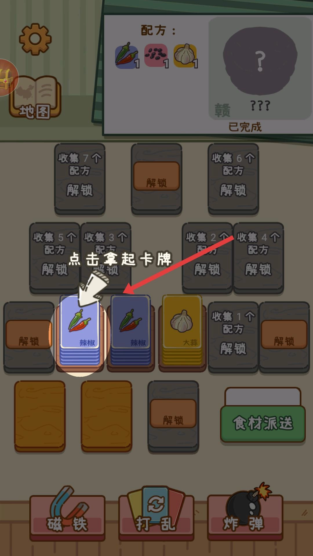 查看上方的配方要求,点击对应的食材卡牌将其拿起,比如配方需要辣椒、豆豉、大蒜,那就选取这些卡牌。