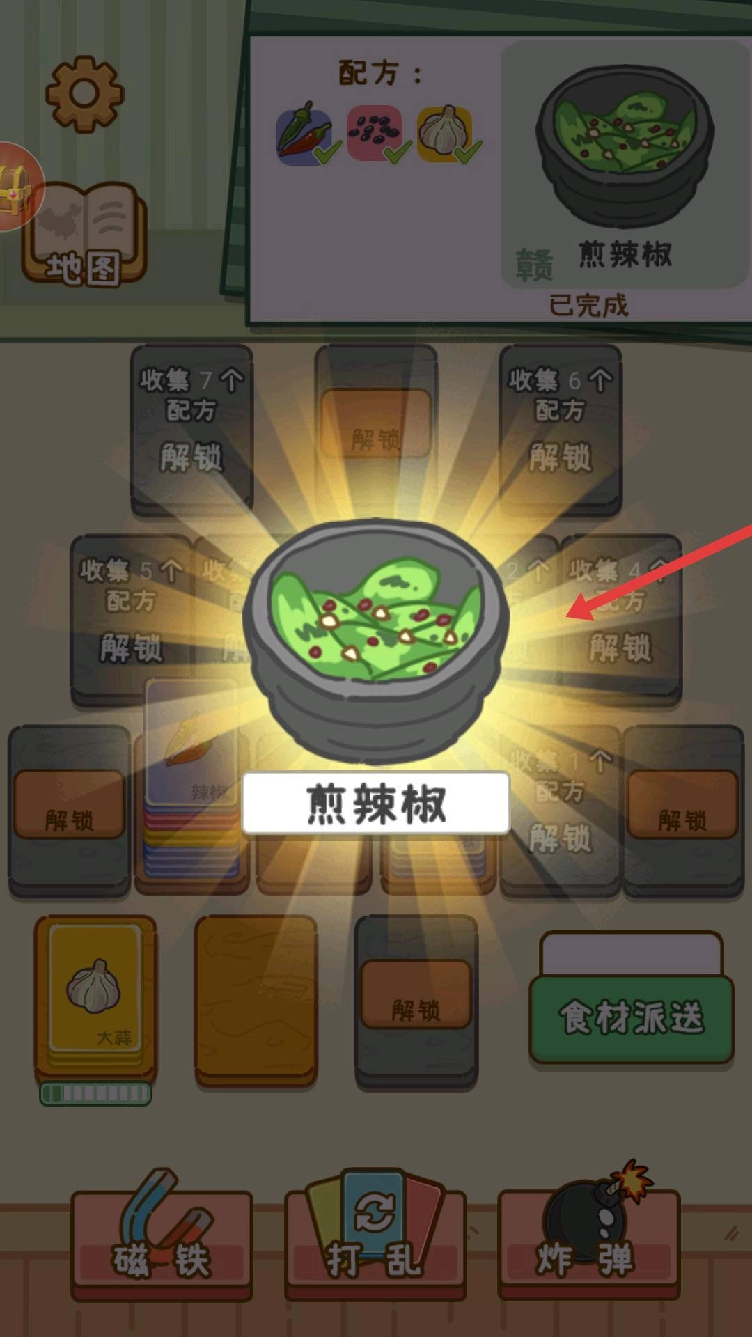 当食材匹配正确时,就能解锁煎辣椒这类对应的菜品;获得新菜品后,还可以继续收集食材来解锁更多的菜谱。