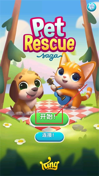 1、进入【Pet-Rescue-Saga】界面后,先点击【开始!】按钮开启关卡,暂无需操作【连接!】,优先推进游戏进程。