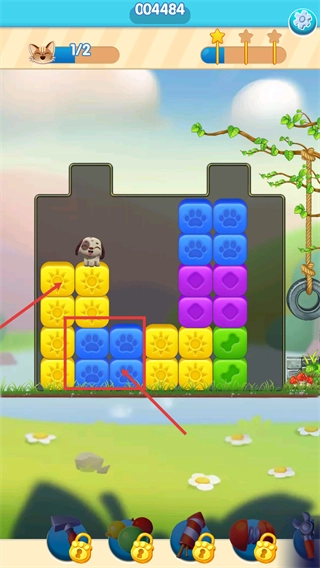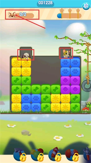 1、将消除玩法与救援使命深度绑定,通过清除砖块让高处宠物掉落获救,核心目标明确,增强闯关代入感。