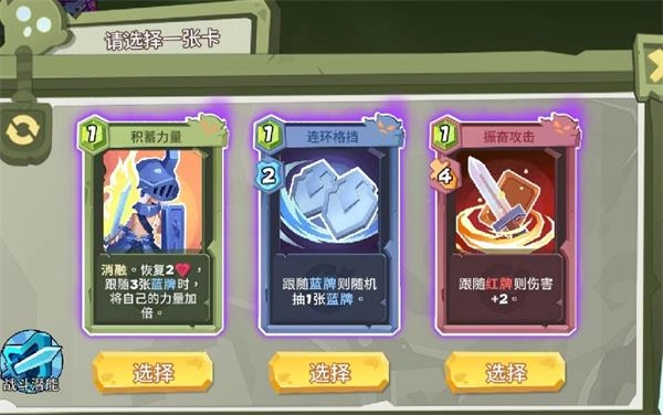 比如下图展示的是第一层S级牛头人的卡牌奖励,能看到三张都是高级卡,由此你应该明白:只要某只怪物曾爆出过高级卡,它就有概率掉落“积蓄力量”。第一层的C、B、A、S级怪物都能爆出高级卡,但A、S级怪物的爆率更高,所以你可以把刷新卡牌的技能都用在A级或S级怪物身上,专门去刷“积蓄力量”。其他卡牌的获取思路也可以参照这个逻辑。