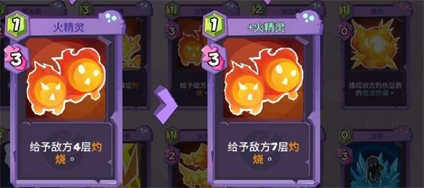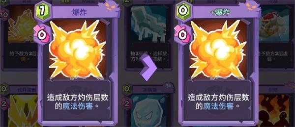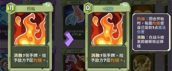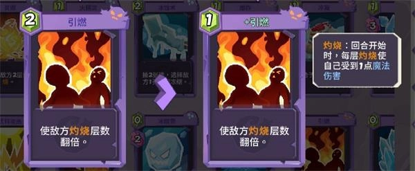 这张卡既能附魔“镜像”效果(抽到时自动复制一张),也能选择火怒附魔(让效果生效两次)。不过火怒的成本实在太高,前期阶段更推荐优先选镜像——通过它能多次触发灼烧的翻倍效果,让灼烧层数呈指数级往上叠。这张卡可以多拿几张,但最好别超过两张,不然会白白浪费强化的次数。另外,第二张引燃卡倒是可以考虑附魔火怒。