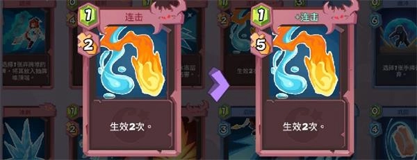另外,普通卡牌“火灌注”(使用时会给敌方叠加4层灼烧效果)也能当作起火卡来用,建议优先给零费卡以及具备多次生效特性的卡牌附魔火元素(例如下面展示的两张卡牌)。需要注意的是,部分卡牌属于“多次攻击”类型,这和多次生效并非同一概念——前者无法二次触发火灌注的效果。