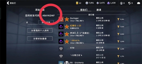 点击好友进入好友界面后,在好友界面输入他人的好友代码便可添加好友,战绩界面点击他人头像进入主页也可添加好友