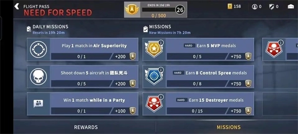 左边为每日任务,右边则是三天半刷新一次。每日任务只有当天有效过期不候,其他任务本次通行证期间都可以完成不会消失,标有hard的为高难度任务,花费时间较长,完成获得的通行证积分也会略高