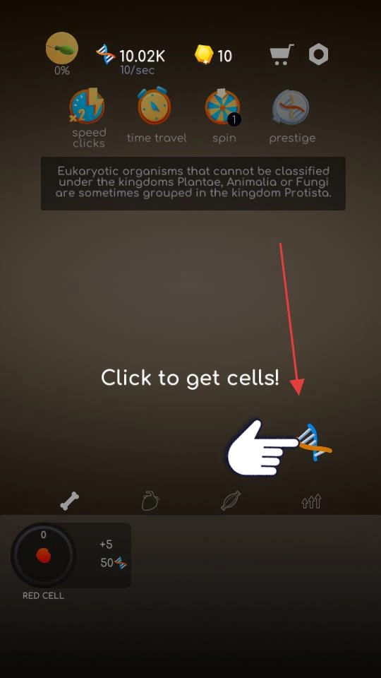 进入佳作后,按照指引点击获取细胞,积累资源,利用加速点击等功能,提升细胞生成速度,推进生命演化过程,开启趣味十足的佳作进程。