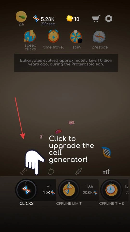 在积累到足够的资源后,按照系统给出的提示点击升级细胞生成器,这样不仅能提高资源的获取效率,还能解锁新的功能和相关的科普知识,从而进一步了解生物演化的内容,丰富佳作的体验层次。