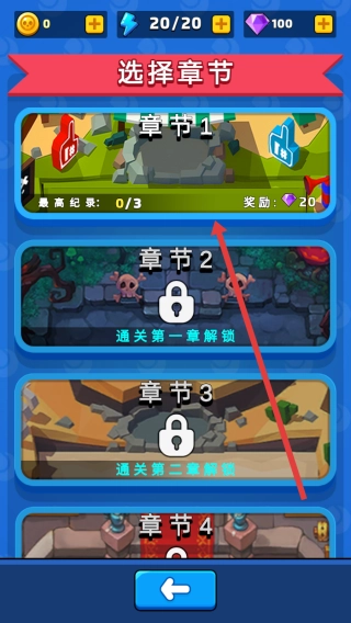 进入章节选择界面后,点击章节1,该章节当前最高纪录为0/3,完成挑战可获得20奖励,现在开始第一章的挑战。