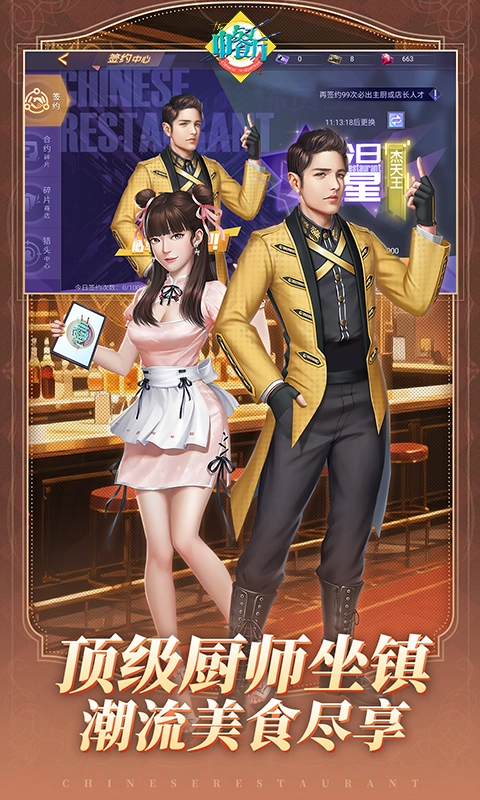 2、创建角色即可兑换包含100连抽的礼包与百万启动资金,轻松招募心仪的店长和主厨,采购豪华食材与餐具毫无压力,助力你成为餐饮行业的巨头。