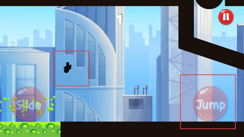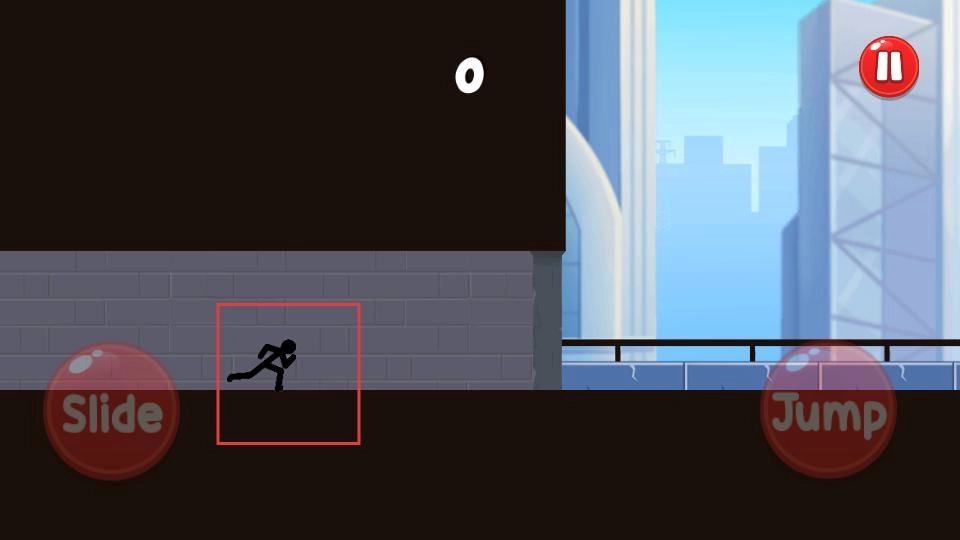 在这款游戏里,火柴人会自行向前奔跑。当碰到较矮的障碍物时,点击左边的Slide按钮,火柴人就会俯身滑行穿过障碍,以此防止发生碰撞。