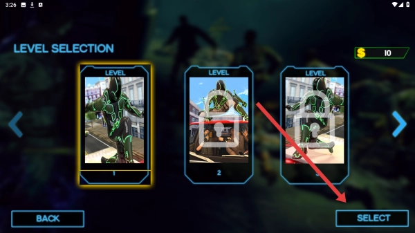 在关卡选择界面,挑选“LEVEL1”,点击【SELECT】按钮,花费10个金币后,即可进入第一关,感受战斗玩法。