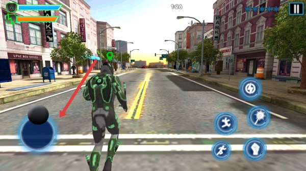 战斗时,通过左侧摇杆操控移动,顺着箭头指引在城市街道中探索,点击技能按钮来对抗敌人,从而推进关卡进度。