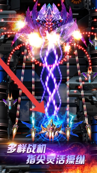 在激烈的战斗过程中,你可以操控多种不同类型的战机(比如箭头所指向的具体机型),通过灵活地调整飞行位置来避开密集的弹幕攻击,同时借助强大的火力系统去摧毁敌方的机甲单位。