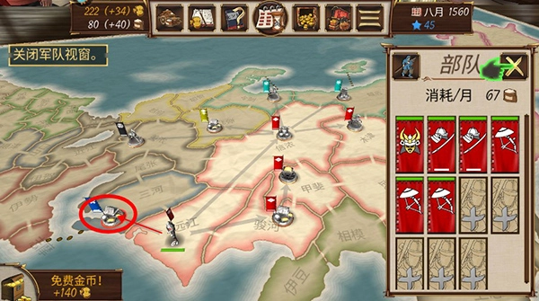 这里以开局的北条为例:换好合适的将领后,立刻出兵攻打武田的武藏地区;下一回合再调转兵力拿下甲斐,做到这一步,开局基本就算成功了。接下来的操作很简单——专注开发领地直到满级,期间持续进行粮食买卖;同时和周边势力保持结盟与通商关系,即便对方撕毁盟约,下回合也要马上重新缔结,核心思路就是尽量避免开战。另外,要把本势力的三个独有技能(就是每次升级需花费500资源的那几个)全部升满,最后攒足兵力,按照从右往左的顺序依次攻打斋藤、伊达、上杉、德川即可。