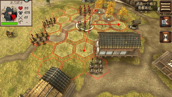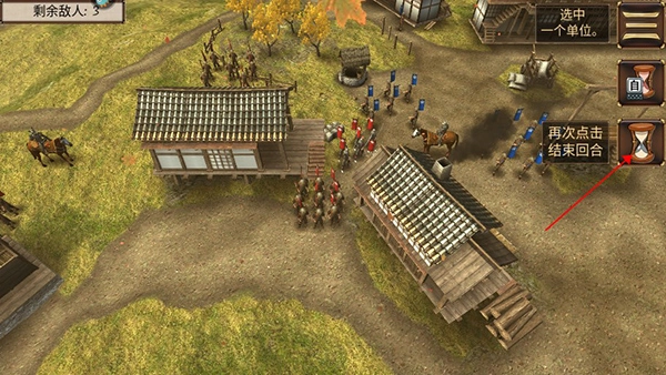 调整部队会消耗步数,玩家需要点击右侧的沙漏来进入敌方回合。等敌方完成移动后,就能重新获得步数。可以慢慢向敌方靠近,一旦达到可攻击的距离,直接选择敌方部队发起进攻。