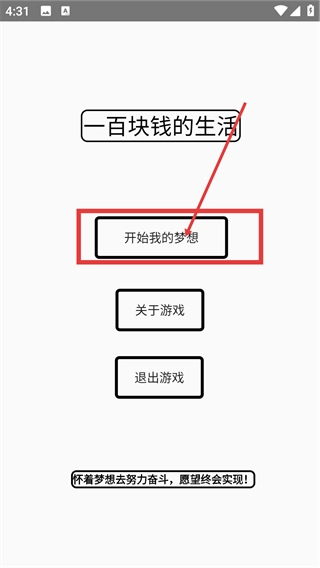 1、首先点击【开始我的梦想】按钮进入游戏,这是开启“一百块钱的生活”挑战的第一步,赶紧跟着开启奋斗之旅吧。
