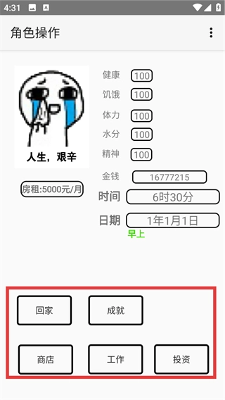 3、在主界面中,先点击【工作】按钮来获取初始资金,与此同时要注意每月有【房租-5000元】的固定开销,建议先攒够钱来覆盖这部分成本。