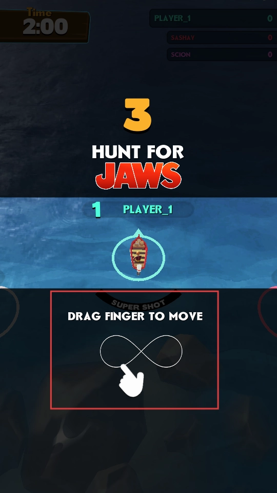 游戏开始时,按照指引用手指拖动小船,在广阔海域中灵活操控移动方向,既要巧妙避开各种障碍,又要抓住时机对鲨鱼发起攻击。每一局游戏限时2分钟,目标是尽可能多地积累分数。
