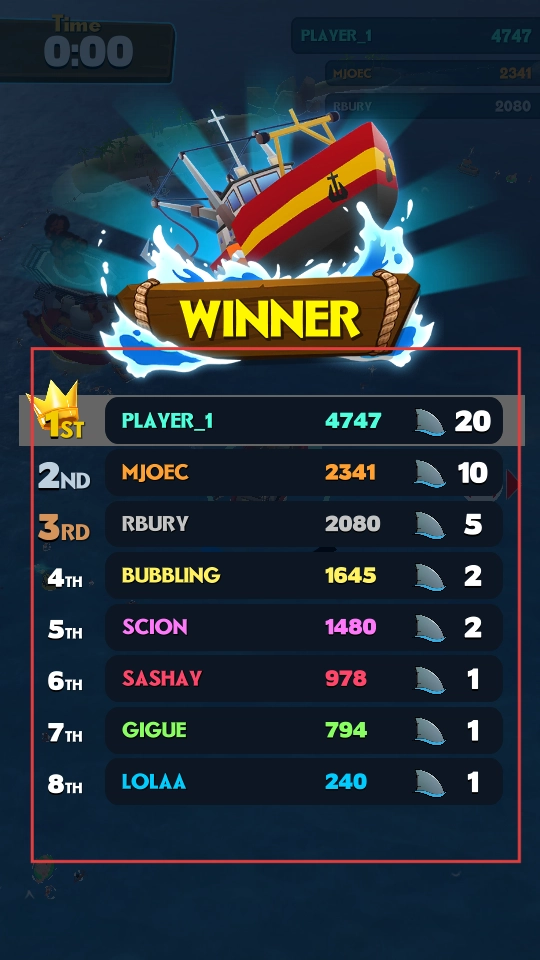 每局结束后,系统会根据分数来排定名次。鲨鱼猎杀数量越多、得分越高的玩家,排名就越靠前,从而有机会赢取奖励,解锁全新的船只皮肤和技能。