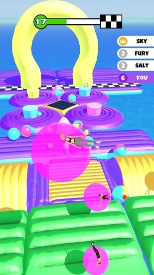 吹出漂亮的泡泡,用它和对手一较高下——在浮动平台上弹跳、停留,把敌人挤下赛道,最终拿下胜利。
