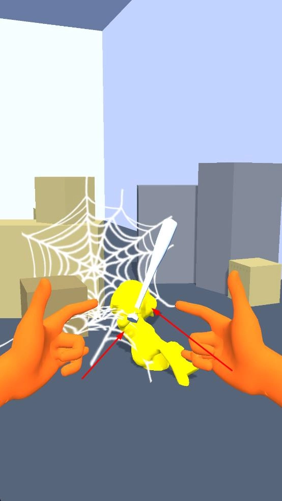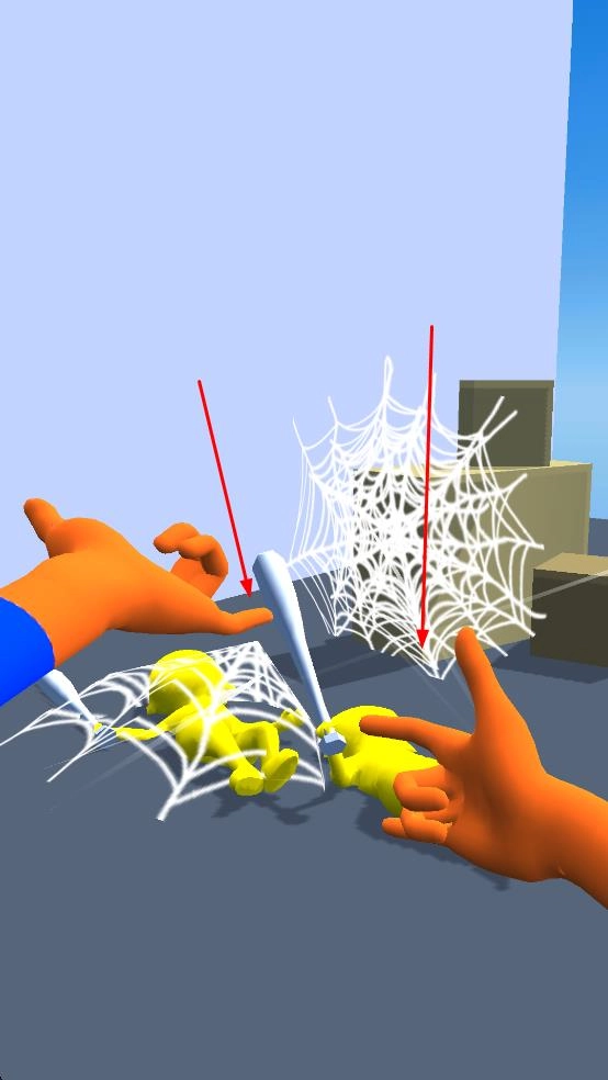 用双手操控工具击打蛛网,解救被困的黄色角色,这是开启救援的关键步骤,能保障进程顺利推进。