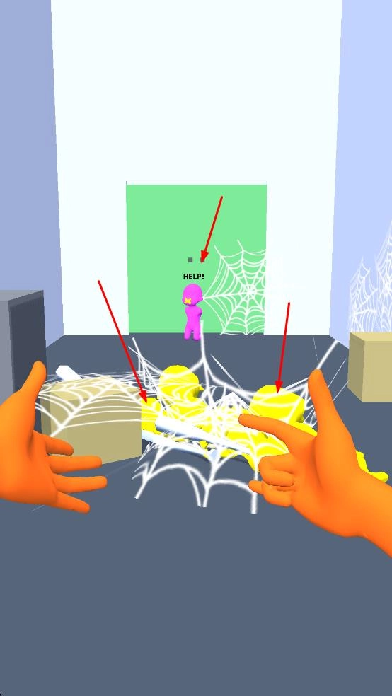 靠近那个粉色的HELP!求助角色,把它周围的蛛网清除掉完成救援,就能拿到相应的奖励,为顺利通过关卡加油。