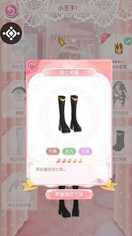 这双黑色骑士长靴颇具西方特色,靴边镶嵌着金色线条,尽显优雅帅气。虽说它看似有些内增高的设计,但丝毫不影响我们小王子散发尊贵气质~获取途径为在荣誉商店进行兑换。