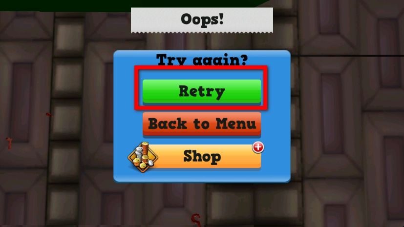 1、要是游戏没通过,点击Retry按钮,就能重新进入该游戏关卡。