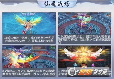 凌厉的招式出手,完美达成击杀;生死对决,不是胜利便是失败;这正是杀戮的真正意义,也是战场的残酷本质。仙魔战场,每天20:00-20:30开放,是多人在线PVP的杀戮战场,只划分阵营,不区分敌友;玩家进入活动后会被随机分配到两个阵营,击杀对立阵营的玩家能获取个人积分,双方阵营要争夺战场中央及四周的哨塔,同时体验击杀敌方阵营的畅快感觉,当积分达到对应要求时就能领取奖励。