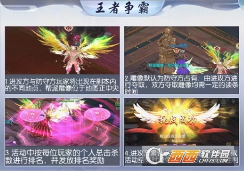 两大帮派的成员需要争夺场景中央的雕像,点击雕像就能开始采集,采集过程需要耗费一定时间;并且同一时间最多只能有一个人进行采集读条操作;活动刚开始时,雕像归属于防守方帮派;活动的胜利方会成为下一次“胜者为王”活动的防守方,而进攻方则由下一次“群雄争霸”活动的第一名帮派担任。