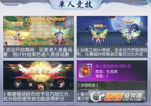 单人竞技和全民擂台的玩法类似,每天晚上9点到9点半开放。活动开启后,参与竞技的玩家会进入备赛场景做准备,同一服务器的玩家会在同一个备赛场景里。系统会依据玩家的段位来进行匹配。根据比赛的胜负情况,玩家会获得相应的段位分,而玩家的排名则通过累计竞技获得的积分来提升段位。段位对应的奖励是每天都能领取的功勋,玩家可以用功勋在商城中购买角色进阶所需的道具以及稀有称号。