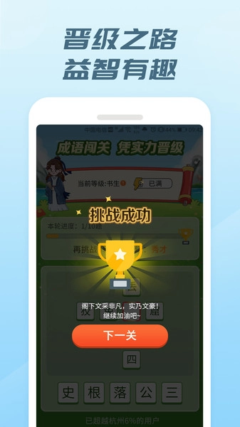 成语有礼这款软件收录了五千多个中华成语,它将学习融入娱乐之中,拥有丰富的题库,难度由浅入深,能充分挑战你的脑力,助你一步步成功晋级。游戏玩法很简单,就是把常见成语组合起来,根据给出的残缺成语提示,把空格中的缺字补充完整就能顺利过关。中华成语源远流长、博大精深,我们耳熟能详的不在少数,但也存在许多平时生活里不常接触到的成语。成语有礼从简单到困难逐步递进,让你在打发闲暇时间、丰富娱乐生活的同时,还能学习到更多的中华文化知识。对于孩子而言,这种有趣的学习方式能让他们更有学习动力,也能让记忆变得更加深刻;对于成年人来说,既能陶冶个人情操,又能提升自身的文化水平。作为一款有趣的成语学习教育类软件,它深受男女老少的喜爱。此外,还有成语接龙闯关模式,经典游戏搭配新颖玩法,让人根本停不下来。快告别枯燥单调的传统接龙方式,一起体验成语有礼带来的欢乐吧。
