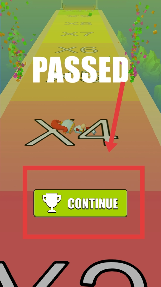 成功通过跑道后,界面会显示“PASSED”,此时点击绿色的继续按钮,就能结束当前关卡并进入下一关,挑战难度更高的跑酷任务。