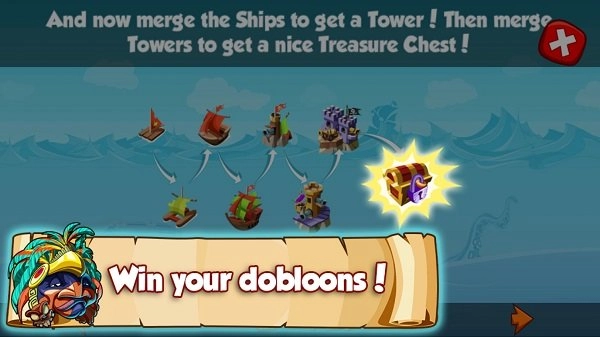 游戏的玩法简单却极具挑战性,你只需把3个或更多的对象相邻摆放,它们就会合并成更高级的对象。不断重复这个操作,直到你的宝箱装满金子就可以啦!是不是很激动?但这还不是全部哦!你得和那些想抢先夺走宝藏的帝国渣滓、海盗们战斗。每完成一次合并,就相当于给你的船员发出了开炮的信号,合并的对象越多,造成的伤害也就越大。