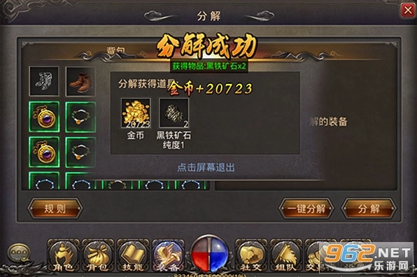 所有装备都能进行分解操作,分解后装备会直接消失。分解装备可得到不同纯度的黑铁矿石,而等级达到或超过50级的装备,在分解时还能额外获取金刚石。