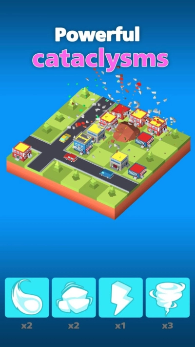 《生存之城龙卷风》的游戏画面简约又清新,玩家将在游戏里前往一座小岛。在岛上,玩家能自由建造各类设施,还能从超多任务里挑选挑战,也有不少过瘾的画风可供选择。游玩过程中,玩家会获得一定数量的不同天灾,需要用这些天灾去破坏关卡里的小镇。不过每种天灾技能的使用次数有限,得通过摧毁城市来让技能恢复使用。