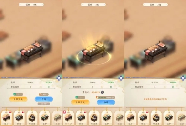 只要满足条件,掌柜就能用[猫玉]或[铜钱]给设备升级。两者的区别是:用[猫玉]升级能马上完成,用[铜钱]升级得等一段时间,要是等不及,掌柜可以用[设备加速券]或[猫玉]来提速。升级后的设备既能提升出餐效率,还能让茶馆的餐品卖得更贵呢!