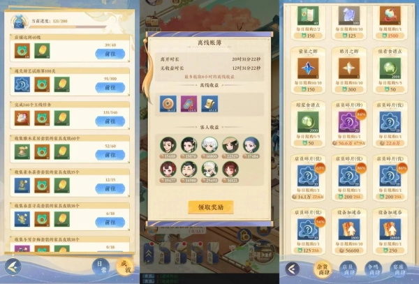众所周知,茶馆的名气越大,生意往往就越好!掌柜能够通过招待客人、完成【日常任务】与【名流之宴】,还有领取[离线账簿],获取对应的店铺声望,以此提升店铺等级。