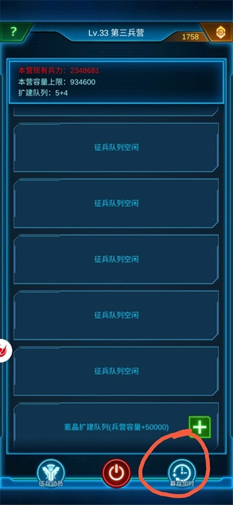 三、兵营右下角设有两个功能按钮:其一为增加生产线造兵时长的按钮,消耗晶体即可延长造兵时间,最长可达2.5小时;其二是增加生产线数量的按钮,但该功能需消耗氪金解锁。只有生产线数量充足且造兵时长足够长,才能实现士兵的大量囤积。