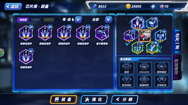 芯片强化能显著增强芯片的各项属性,从而获取更可观的属性加成。芯片库中的芯片会依据等级划分为不同星级。就拿攻击型芯片来说,量子超导体这类芯片能够提升武器攻击、装甲值与耐久度等附加属性。强化芯片需要消耗资金和元件,要是元件数量不足,还可以通过分解暂时用不上的闲置芯片来获取。