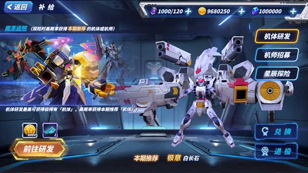 在机体研发界面能查看本期推荐的机体,机体研发不仅有机会获取极稀有机体,而且获得本期推荐机体的概率相当高!研发过程需要消耗资金和扭蛋补给券,进行研究还能积累研究积分,当积分达到对应要求时,就能兑换超级机甲与机师了。