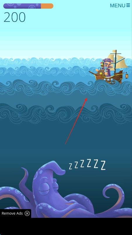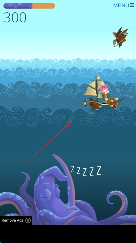 操控红色箭头标识的帆船在海面航行,途中要避开处于沉睡状态的紫色章鱼,将进度从200收集到300。