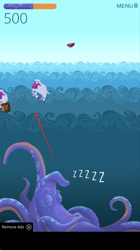 切换成绵羊角色,在海面上踩着红箭头跳跃前进,注意避开藏在水下的章鱼,一直往前推进,顺利完成这一关卡的挑战。