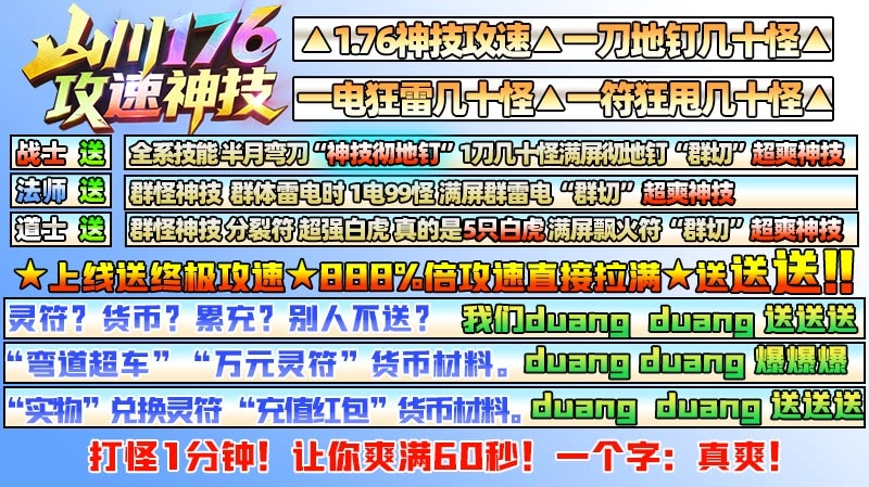 山川176攻速神技是一款畅快的复古传奇。简单挂机冒险,自动回收装备,让玩家无需费心就能沉浸在传奇热血世界。超高爆率,让散人玩家打金更添乐趣,支持武器自由交易,轻松让你收获百万元宝。各类挑战活动不定时开启,让玩家拥有丰富的挑战机会,在战斗中持续提升自身能力,在冒险中不断成长变强。
