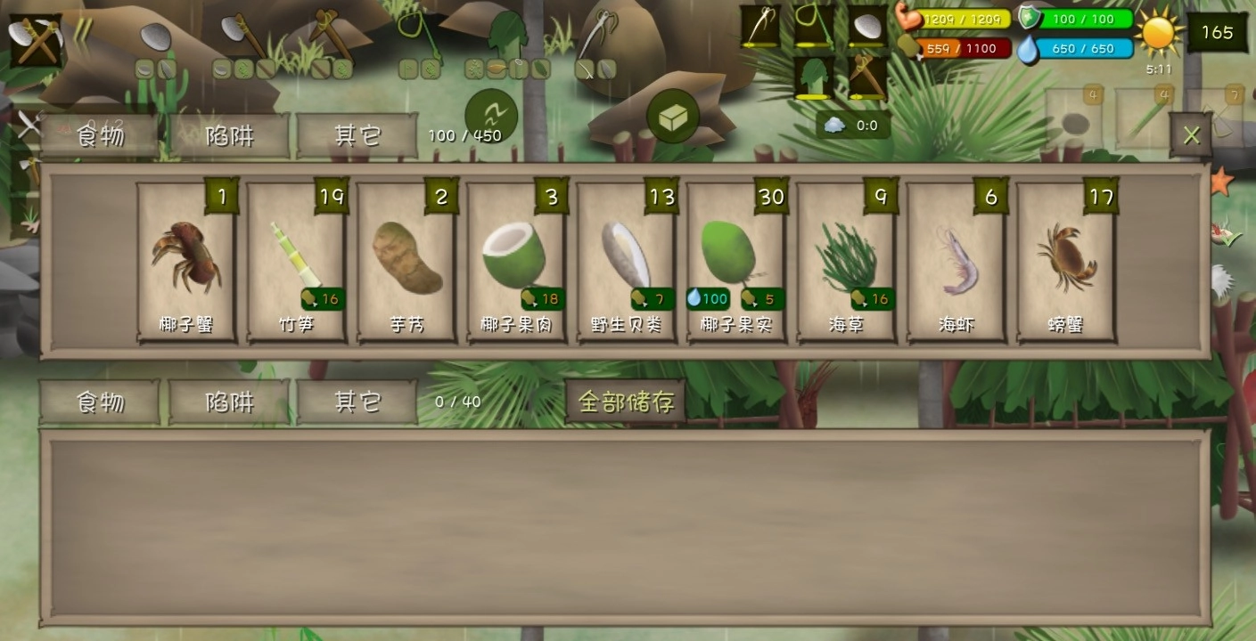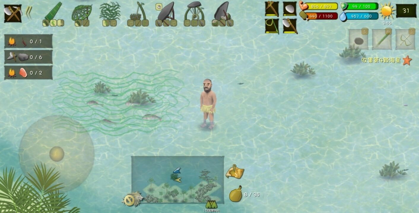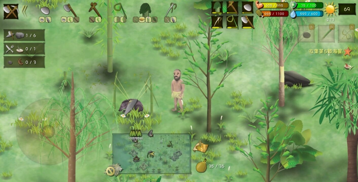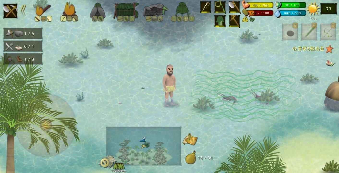 前期可以摘椰子、捞海草、捡贝壳,还能打四脚蛇、捉螃蟹,或是挖芋艿、挖竹笋、掏鸟蛋。