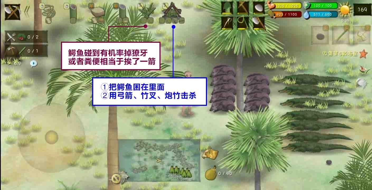③大家在这个地图里一定要养成随时保存的好习惯,毕竟菲律宾海岛的鳄鱼第一天就会现身攻击你,得留意自己的健康值——要是被咬了,要么立刻退出重进,要么赶紧走位躲避。对了,这个图的鳄鱼不会下海,而且腿短,追不了你太久,所以猎杀陷阱也别设得太远,放在它常出没的地方就行。