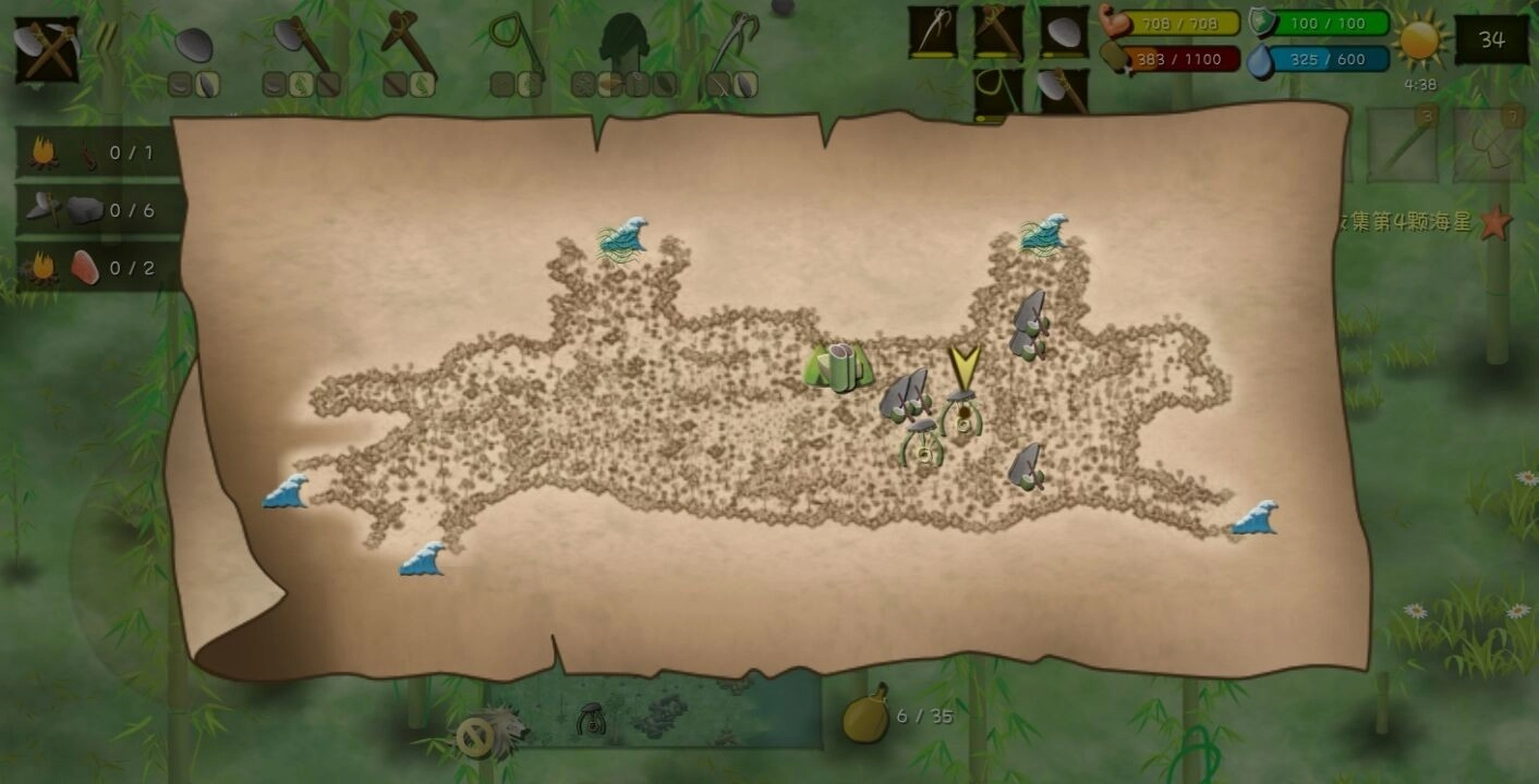 前期营地可以选在两片竹林的上方位置,这样往下走就能砍到不少竹子,还能采摘竹笋。(营地用石头或木头搭建都可以)
