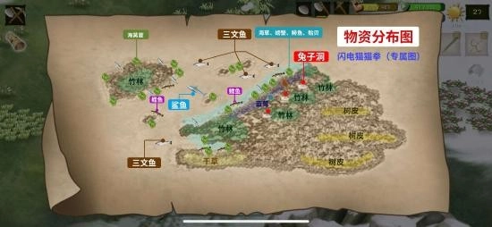 开局我们可以选在海边搭建房屋,初期挑一处风水宝地能为后续生存打下好基础。营地附近有3个兔子洞,这是前期肉类的主要来源,我们可以制作2-3个石板陷阱来捕捉兔子;兔毛(松鼠毛)还能用来制作御寒的衣服。如果条件允许,也可以用【雪地陷阱】捕捉麋鹿和雪狐,麋鹿切割后能获得2个【优质皮毛】,雪狐切割后则有6根毛。海边有莴苣、海草、鳕鱼、螃蟹等食材,方便我们及时补给。主岛和副岛之间直线距离最短,来回最便捷,中途还有三文鱼和鲨鱼的刷新点,我们可以在这里放置陷阱。附近还有竹林,方便我们砍伐竹子和进行种植。
