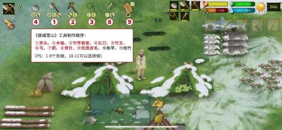 开局制作工具的先后次序如下:①斧头、②竹竿套索、③木锄、④石刀、⑤竹叉、⑥弓、⑦箭、⑧除虫剂、⑨骨针、⑩炮竹